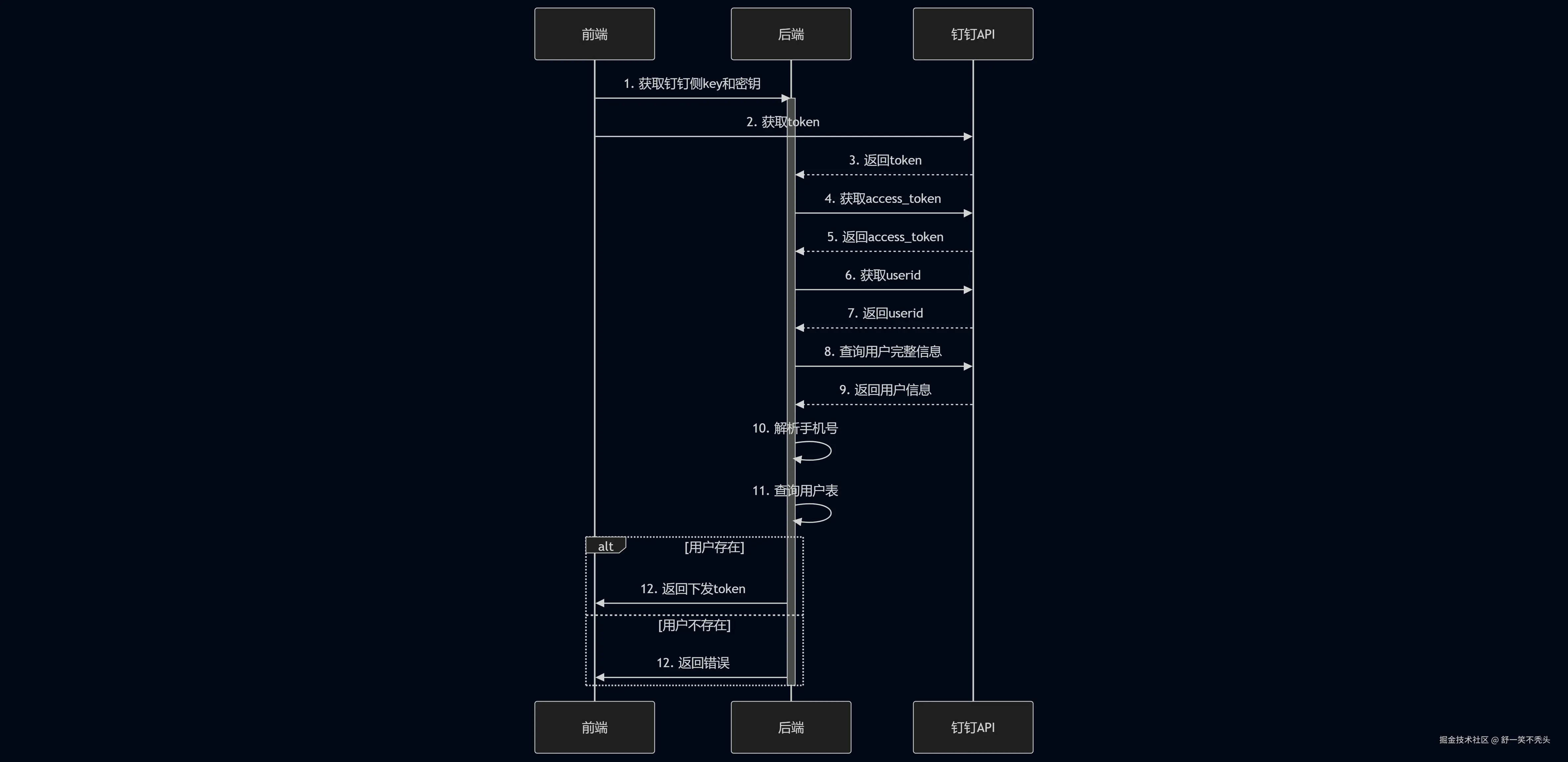 下图中需要说明的一点是,准确来说步骤3来说是钉钉API返回给前端,前端携带一次性校验码token给后端进行后续的鉴权。