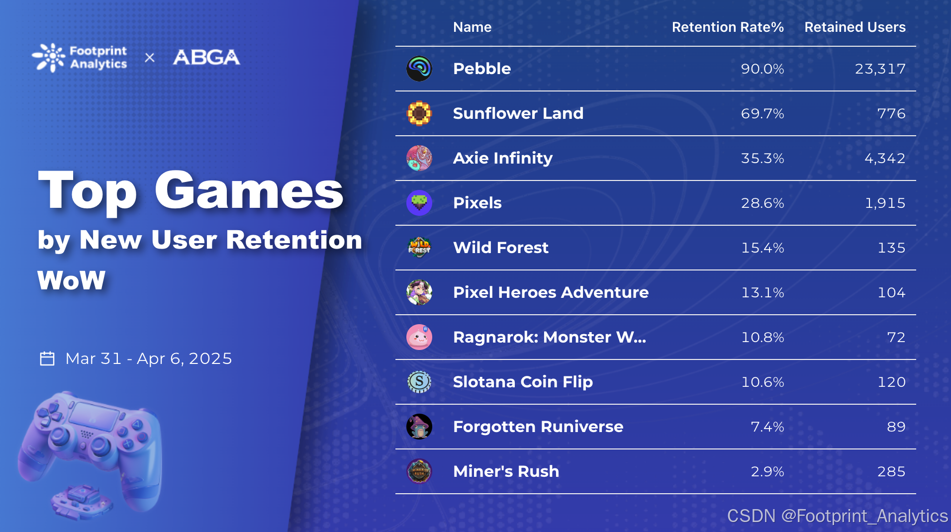 新玩家留存率周榜 Top 10: Pebble、Sunflower Land、Axie Infinity 领先