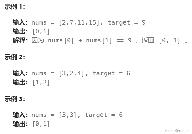 nums = [3, 3], target = 6,nums.index(rem)总是返回第一个 3 的索引,导致输出[0, 0](错误)。 - 低效:对每个元素都遍历整个数组,数据量大时速度慢。