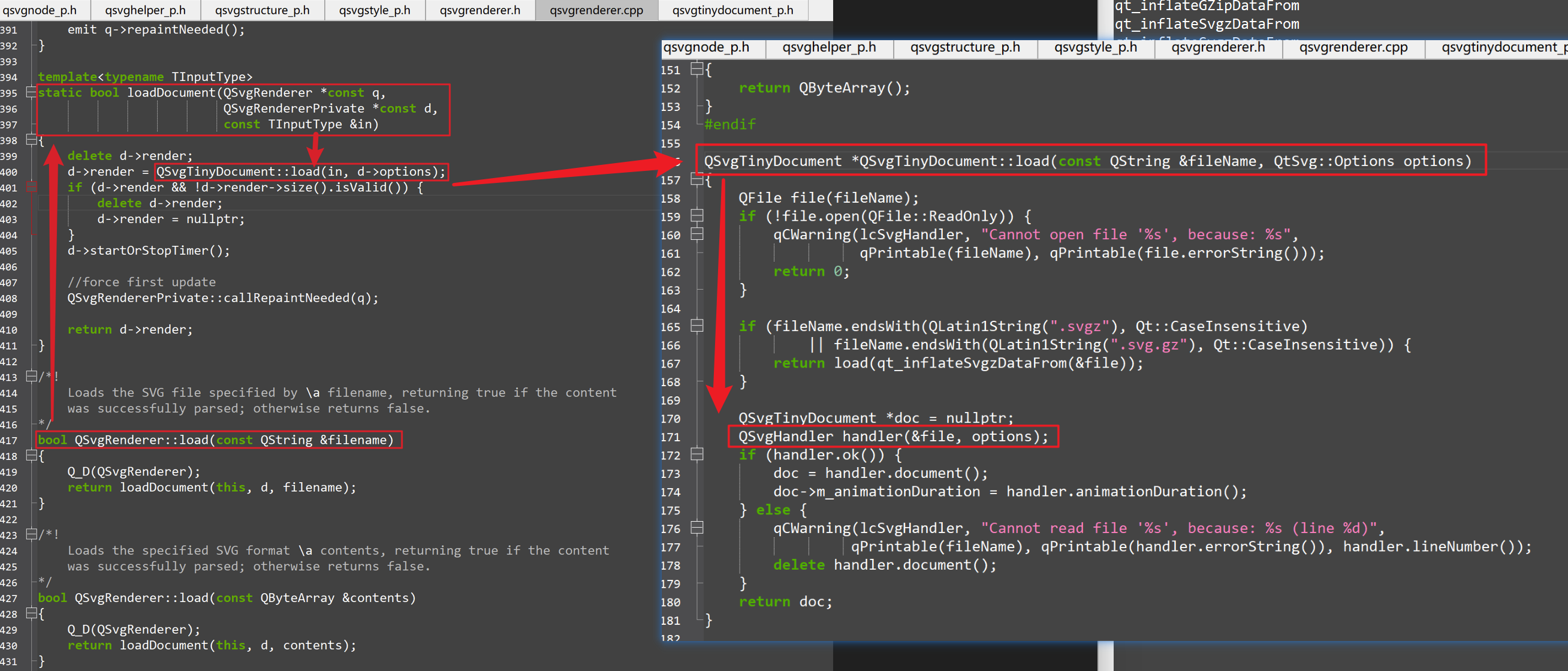 QSvgRenderer 加载 svg 文件后,由 QSvgTinyDocument 类负责解析文件。QSvgTinyDocument 通过 QSvgHandler 执行具体的解析工作,QSvgTinyDocument 存储了解析后的 SVG 结构、样式等信息。