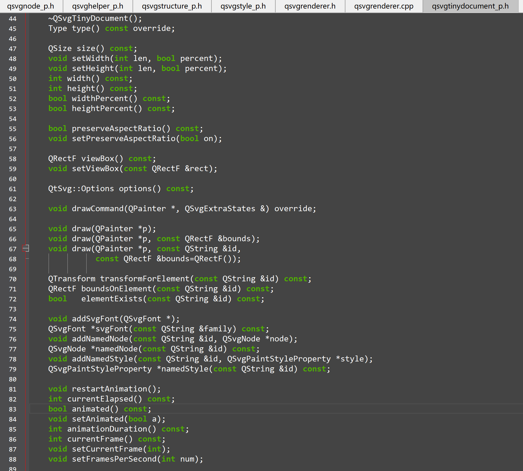 QSvgTinyDocument 类的 draw() 方法调用 QSvgNode 类的 draw() 方法绘制具体的 node,而 QSvgNode 类的 draw() 方法中通过虚函数 drawCommand() 将具体的图形绘制工作交给了其子类。QSvgNode 子类定义在 qsvggraphics_p.h 文件中,其定义了 SVG 支持的各种图形、路径、动画等的描述类,这些类都继承自 QSvgNode 并实现了虚函数 drawCommand(QPainter *p, QSvgExtraStates &states) 定义了对应图像如何在 QPainter 上绘制。