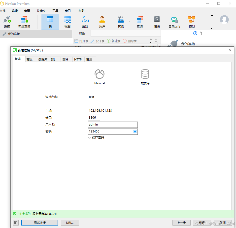 连接名称随便写,主机这里的话,如果是在Windows本地搭建的MySQL服务,就默认使用 localhost 即可,但是这里用的是VMware CentOS-7 搭建的MySQL服务器,所以这里的主机就是虚拟主机的IP地址。如果不指定有MySQL服务器的主机,会一直出现 2002 错误 ,换个角度来看就是找不到主机的MySQL服务。这里的用户名和密码就是上面自定义创建的用户,host必须是 % 才可以远程!最后点左下角的测试连接即可。如果一秒没有响应,那是不可能通的。