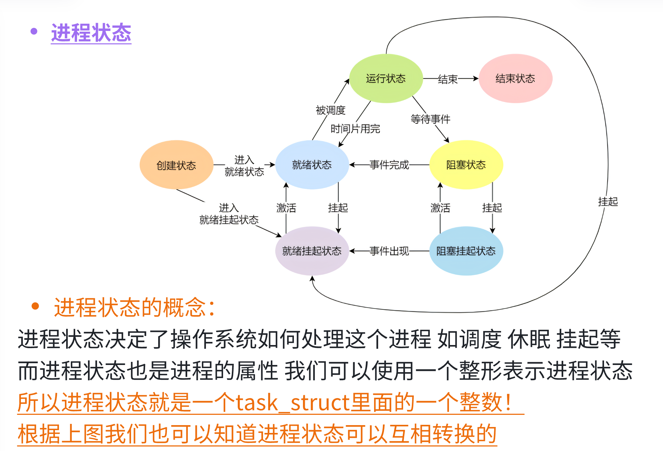 - 为了弄明白正在运行的进程是什么意思,我们需要知道进程的不同状态。一个进程可以有几个状态(在Linux内核里,进程有时候也叫做任务)。