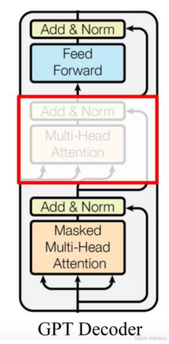 如上图所示, 经典的Transformer Decoder Block包含3个子层, 分别是Masked Multi-Head Attention层, encoder-decoder attention层, 以及Feed Forward层。但是在GPT中取消了第二个encoder-decoder attention子层, 只保留Masked Multi-Head Attention层, 和Feed Forward层。