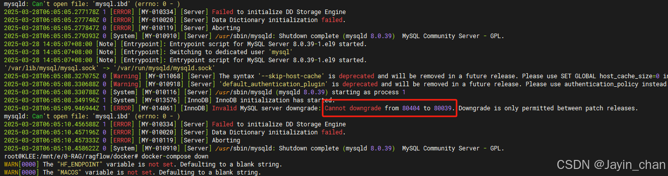 mysql启动报错:这个是由于我之前本地有个8.4版本的。直接删除容器卷上的数据就可以了
