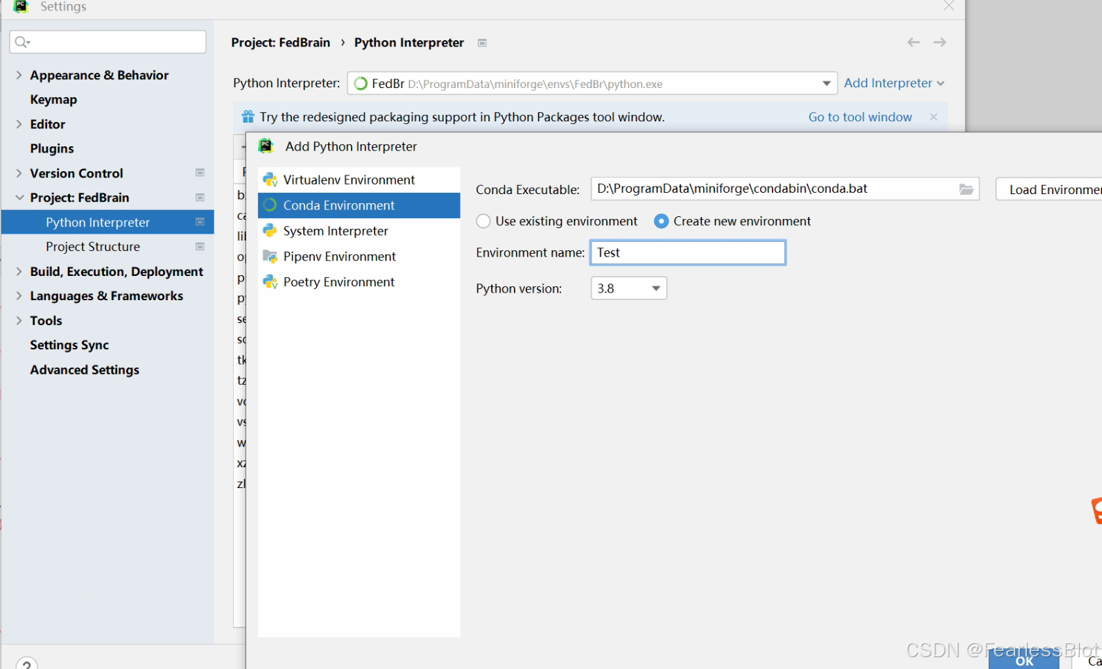 (1)创建一个项目,后选择 Conda Evvironment,在 conda Eexcutable 中找到