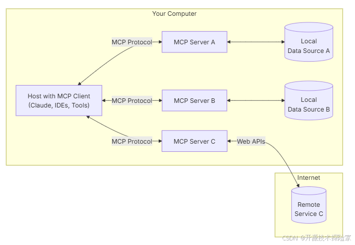 - MCP服务器:提供具体功能服务的轻量级程序(如文件管理或API调用)。