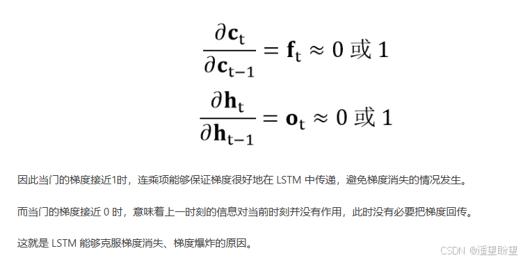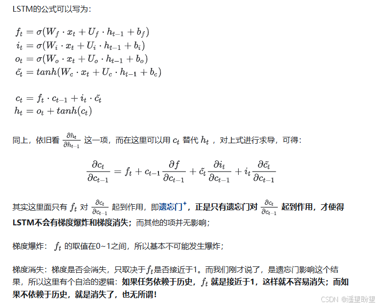 - 实际中,遗忘门通过学习动态调整 f t f_t ft(接近 1 时保留历史信息,接近 0 时遗忘),避免梯度因激活函数导数衰减而消失。