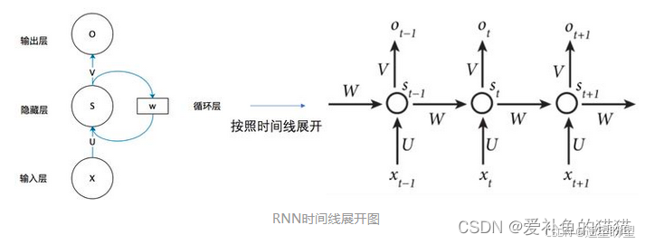 图中 x、s、o (或x、h、y)分别代表 RNN 神经元的输入、隐藏状态、输出。