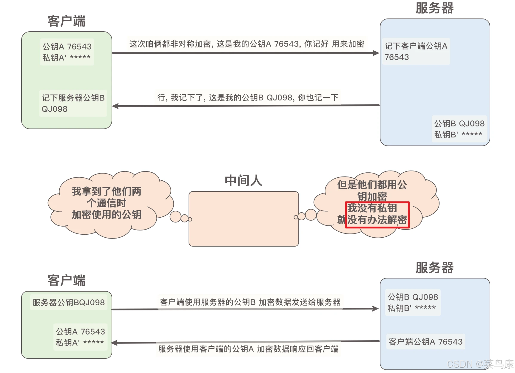 这样, 都是用公钥对向外发送的数据加密 的. 中间人即使获取了两个公钥, 也无法获取到数据内容: