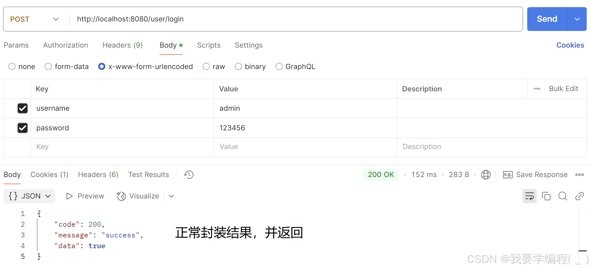 之所以会出现封装了两层的现象,是因为我们前面已经将登录接口的返回对象进行了封装,而这里再次对 body 进行了一层封装。因此,我们可以先将前面封装的结果修改为最原始的状态,再次启动项目,访问接口观察: