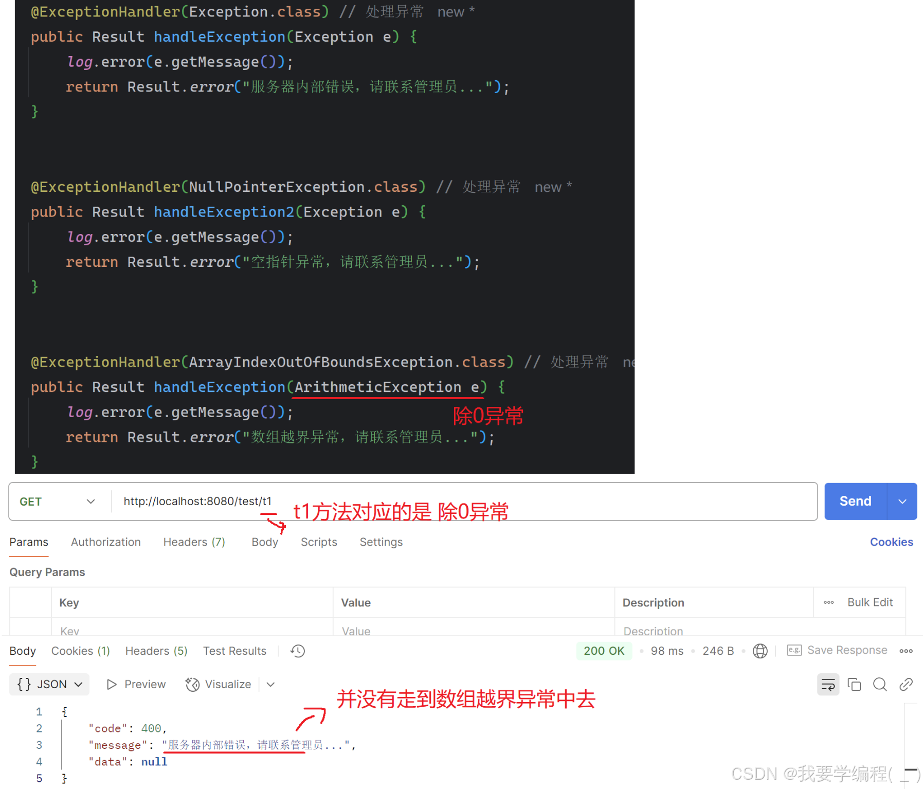 注意:当通过注解的方式来表示是那个异常信息之后,参数列表内部的异常信息就会失效,也就是说Spring会优先根据注解去捕获异常信息,而不是参数列表。