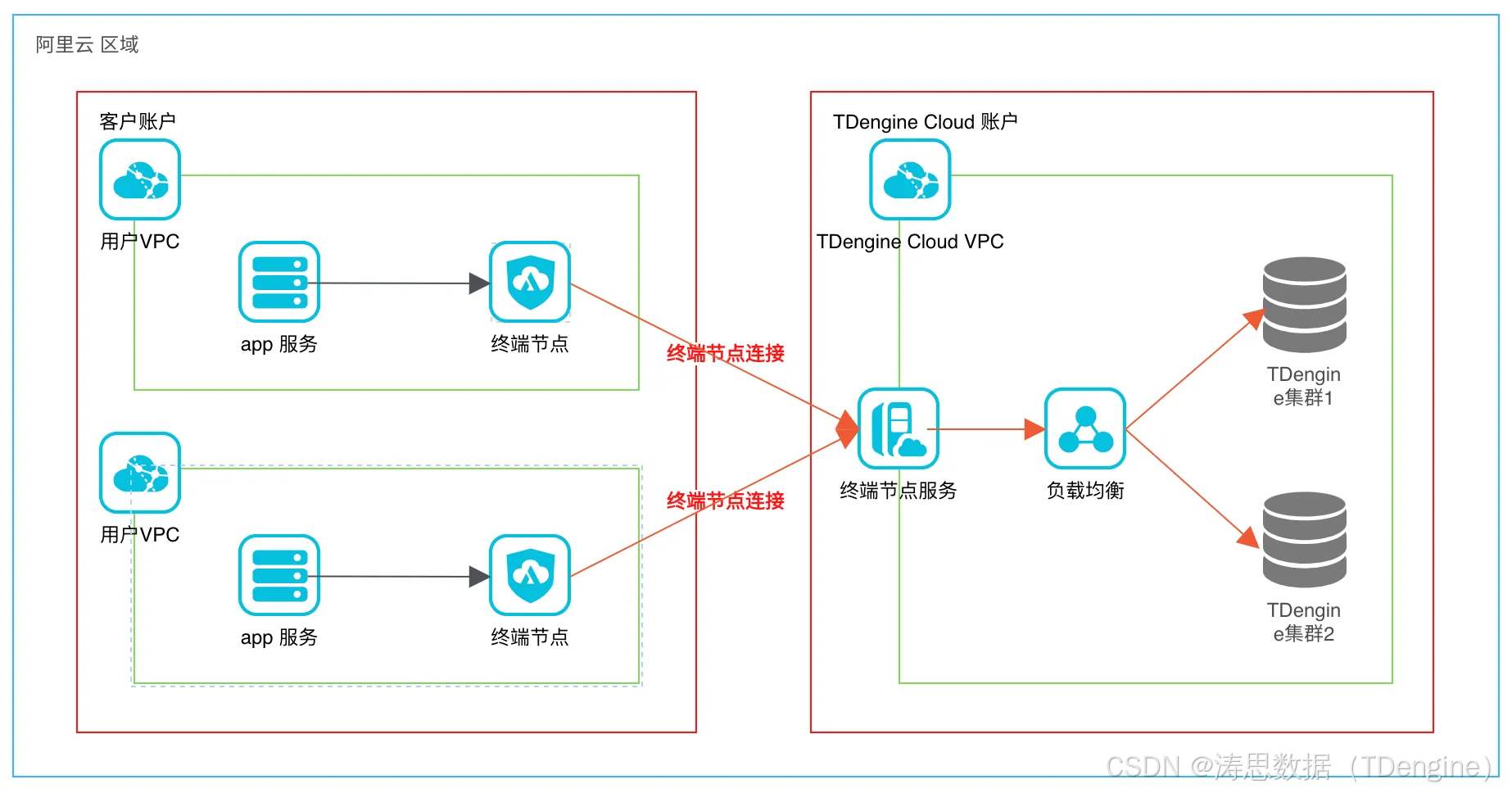接下来,我们将通过一个具体客户实例来深入探讨 TDengine Cloud 私有连接服务的技术架构。例如,一家公司使用其阿里云账号在上海区域创建了一个 VPC,并在此 VPC 内部署了终端节点以连接到 TDengine Cloud 提供的终端节点服务。而TDengine Cloud 则通过负载均衡器将请求转发至客户的 TDengine 集群。
