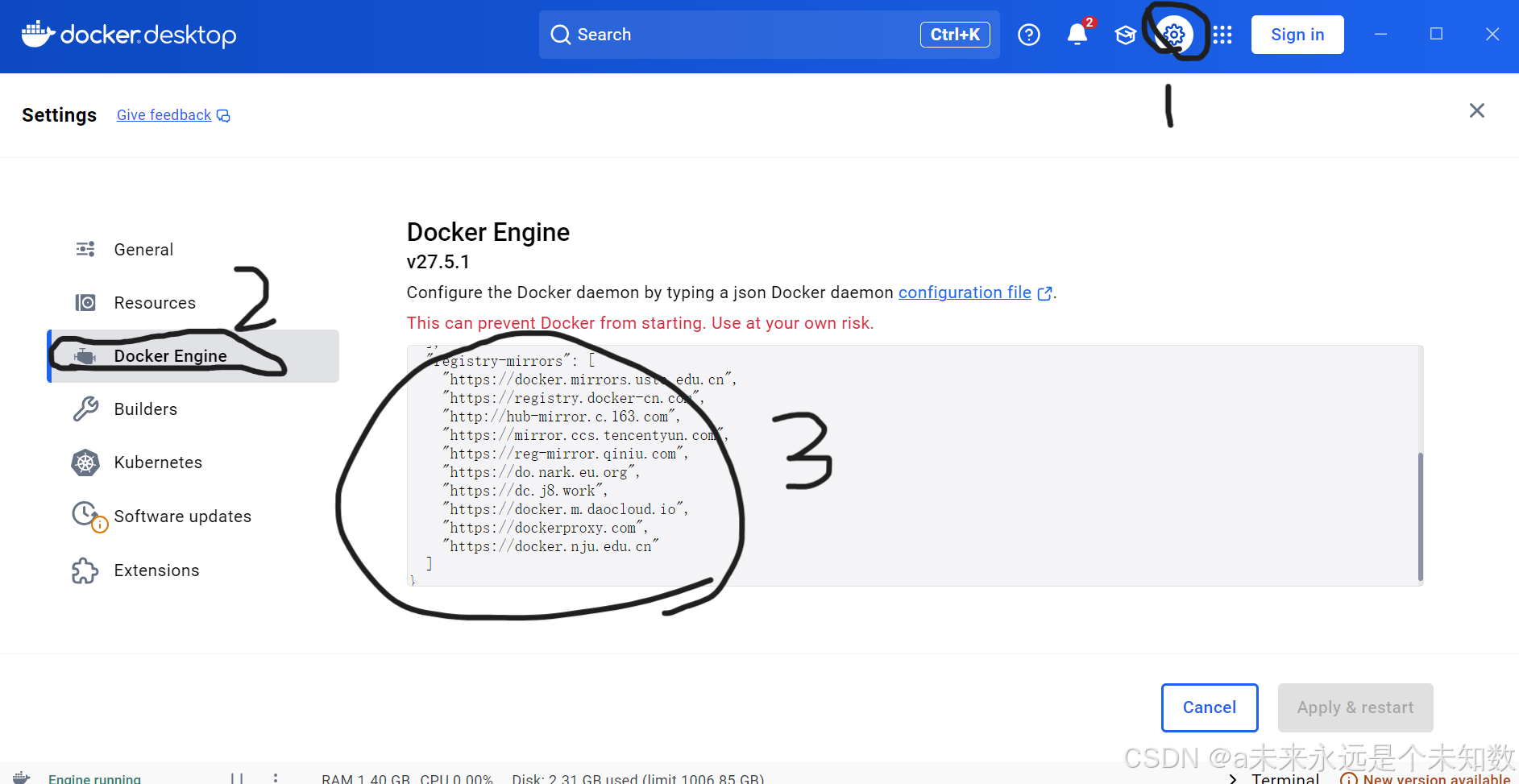 点击小齿轮进入设置页面,点击左侧菜单栏的docker engine ,设置国内镜像源,如下图所示: