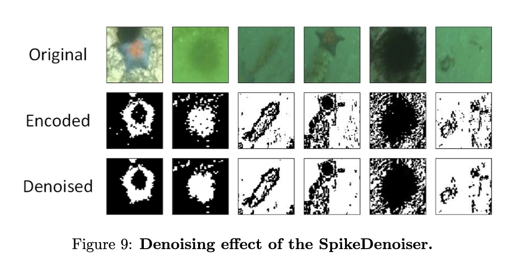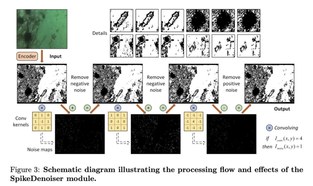设计了一种与尖峰兼容的新型水下图像去噪方法,可无缝集成到SNN架构中。这种方法只需整数加法计算,以最小的计算开销显著提高了图像质量。