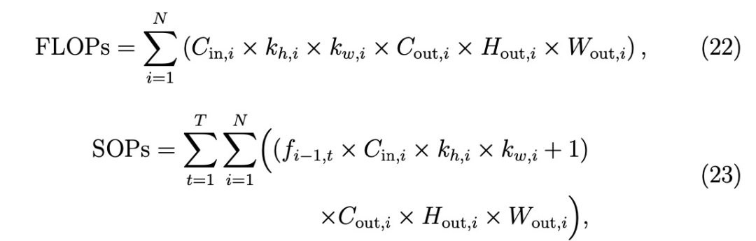 在传统的人工神经网络中,计算成本是以FLOPs(浮点运算次数)来衡量的,它代表浮点运算(加法或乘法)的次数。然而,由于SNN通过离散的尖峰进行通信,计算FLOPs就不那么简单了。相反,我们使用突触运算(SOPs)作为计算成本的度量。SOPs考虑了每一层的卷积操作和前几层的尖峰发射,同时还考虑了神经元充电时的浮点加法。FLOPs和SOPs的公式定义如下: