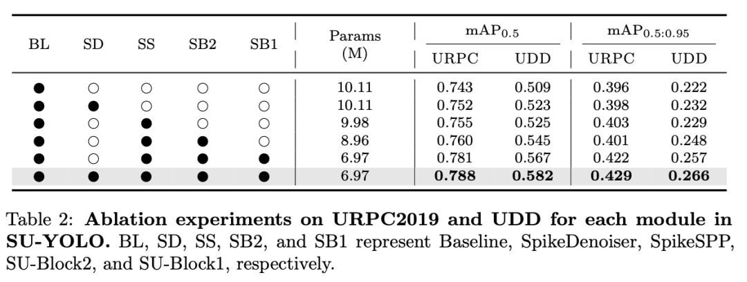 残差块是特征提取的核心,对检测精度有重大影响。为了评估我们设计的SU-Block的性能,我们在保持整体网络结构不变的情况下,试验了不同的残差块。我们在URPC2019上计算了不同残差块的平均尖峰发射率。如表5所示,采用CSPNet结构的SU-Block的点燃率分别为12.7%、15.4% 和18.8%,高于采用ResNet结构的EMS-Block的点燃率(15.2%、11.9%和11.5%)。这一观察结果与我们的可视化分析相吻合: SU-块能有效缓解尖峰退化,释放更多尖峰,从而增强特征提取。此外,表5显示,使用SU块的SU-YOLO实现了78.8%的出色 mAP0.5,明显高于使用EMS块或ANN版本中使用的残差块所获得的结果。
