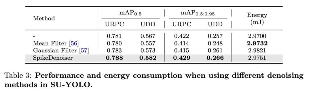 为了评估计算成本,我们在表3中比较了传统图像去噪方法和我们提出的SpikeDenoiser。