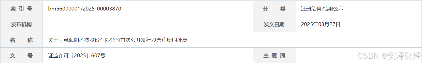 3月27日,证监会核发了海阳科技股份有限公司(如下简称海阳科技)上交所主板的IPO注册批文。东兴证券为其保荐机构,海阳科技拟募资6.12亿元。