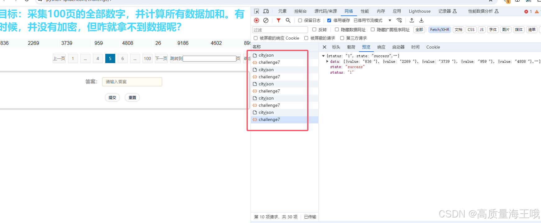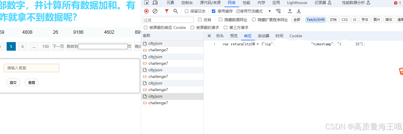 1. 首先先抓包能看到抓取第一页,第二页,第三页,第四页的时候每次 challenge7 请求前面都有个 cityjson 请求,这里后台有个请求规律判断,必须请求 cityjson之后在请求challenge7才能获取数据。