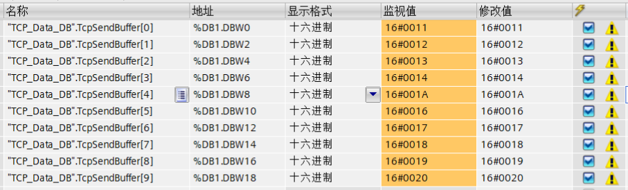 因为调试助手中是以字节显示的,而PLC发的是WORD,因此调试助手中两个字节组成一个字,即可发现,两者信息一致。