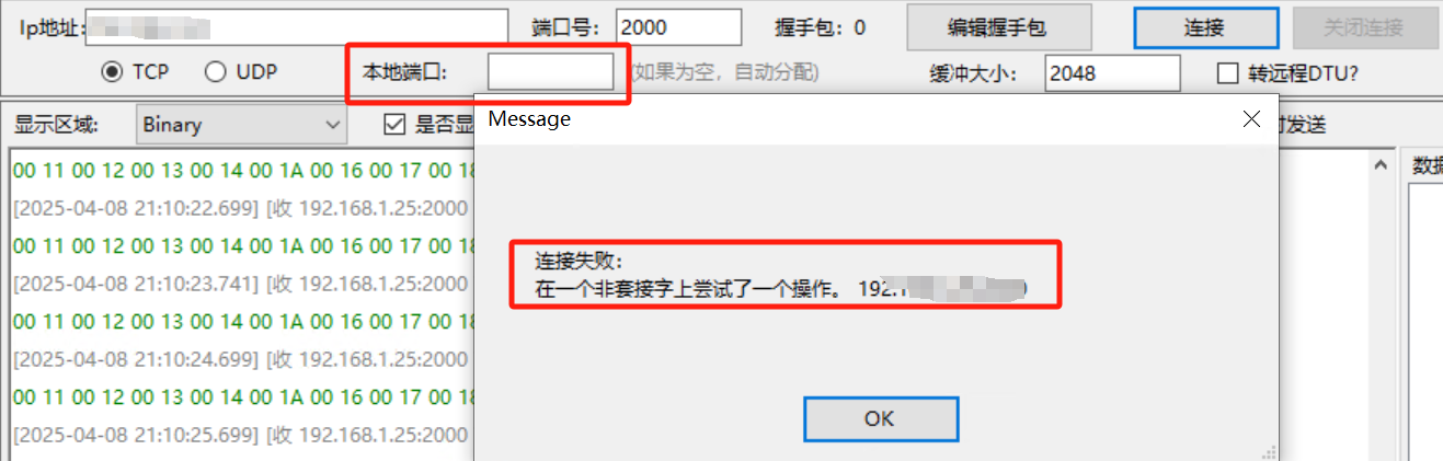 调试前有一点需要说明,调试助手中有"本地端口"需要设置,否则不能建立连接。当本地端口为空时,会收到报错信息,如下图所示。