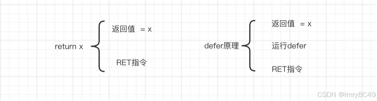 可以看到 return 执行的时候,并不是原子性操作,一般是分为两步:将结果x赋值给了返回值,然后执行了RET指令;而defer语句执行的时候,是在赋值变量之后,在RET指令之前。所以这里注意一下。返回值和x的关系。如果x是一个值类型,这里是进行了拷贝的。