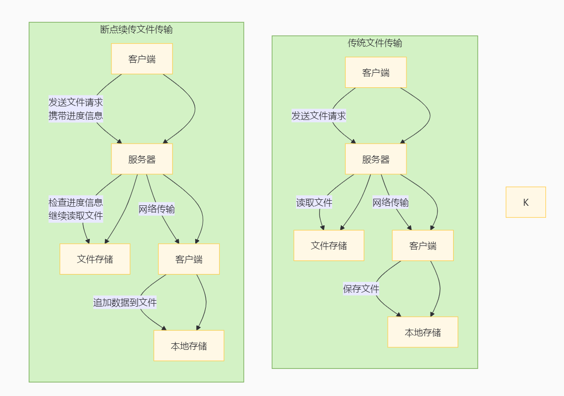 | 网络中断恢复 | 重新开始 | 继续传输 |