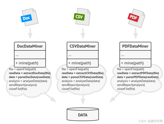 假如你正在开发一款分析文档的数据挖掘程序。用户需要向程序输入各种格式(PDF、DOC 或 CSV)的文档,程序会试图从这些文件中提取有意义的数据,再以统一的格式返回给用户。