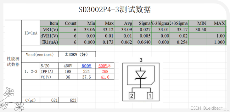 以上数据可以看到:SD3002P4-3 本身完全可以抗8/20μS 波形500V浪涌。