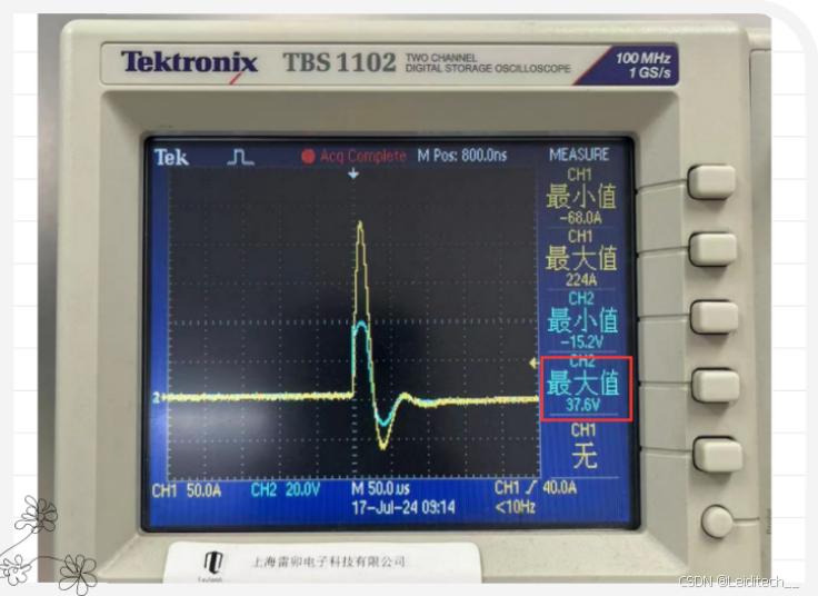 实验采用雷卯电子 SUG61005TB 浪涌发生器进行 400V/8/20μs 标准浪涌波形模拟,使用 ESD 防护器件 SD3002P4-3 实施浪涌电压钳位。经测试验证,钳位后的电压波形如图所示: