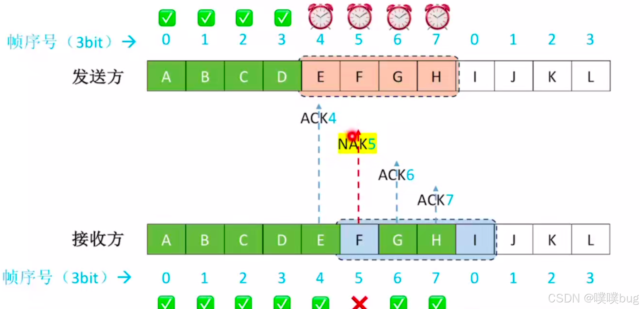 接收方会给发送方。返回四号,六号,七号帧的ack以及五号帧的nak。引入了请求重传机制,即请求5号帧重传。