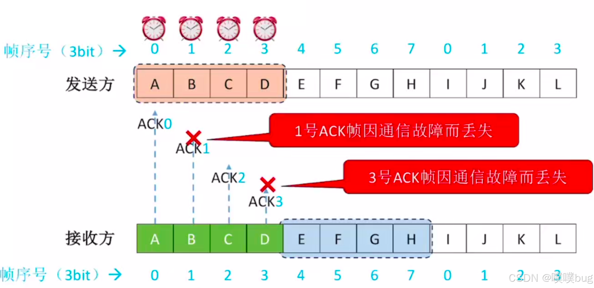 接收方返回的ack3丢失且接收窗口正常滑动到下一个帧,发送方零号、一号、二号、三号帧超时重传,发送方这次传过来的零号帧并不是接收方真正想接收的