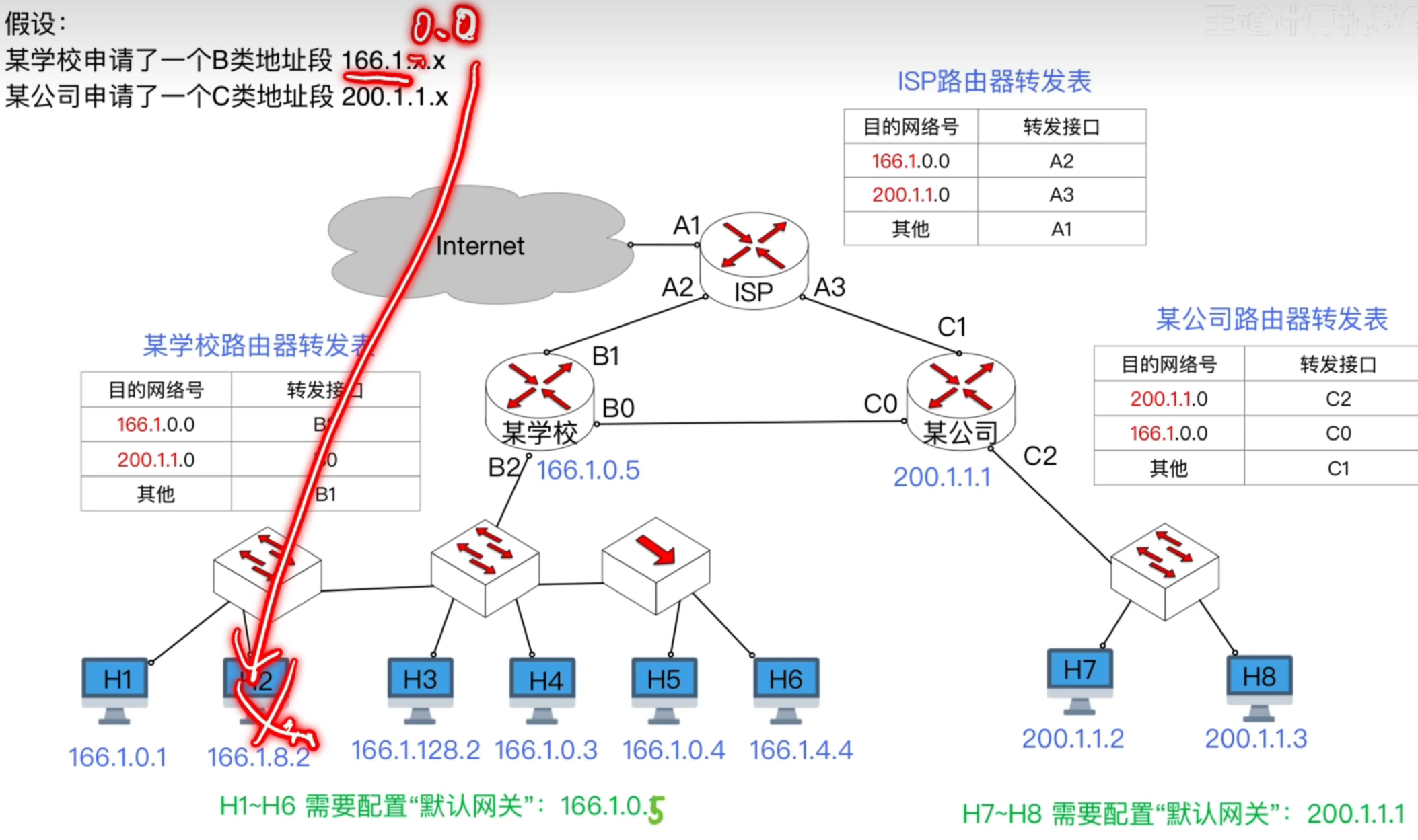 比如学校申请了166.1.0.0这样的B类地址,但是末尾的十六位全为0的IP地址是不能分派给主机的