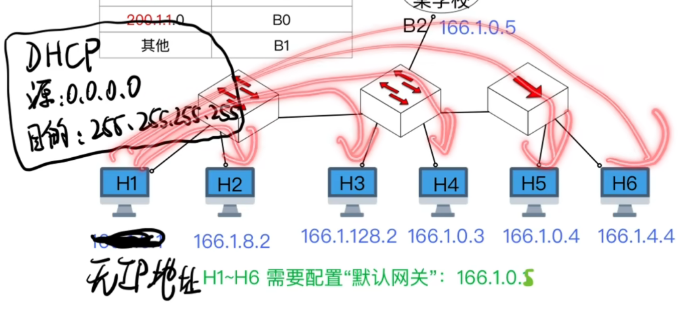 比如H1要给自己所处的网络广播一个IP分组,那么它可以把源地址设为自己的166.1.0.1,然后把目的地址设为全1,那32位全1对应的就是255.255.255.255,每8位为一组,那这样的IP数据报就会广播给自己所处的网络中的每一个节点,当然也包含这个默认网关