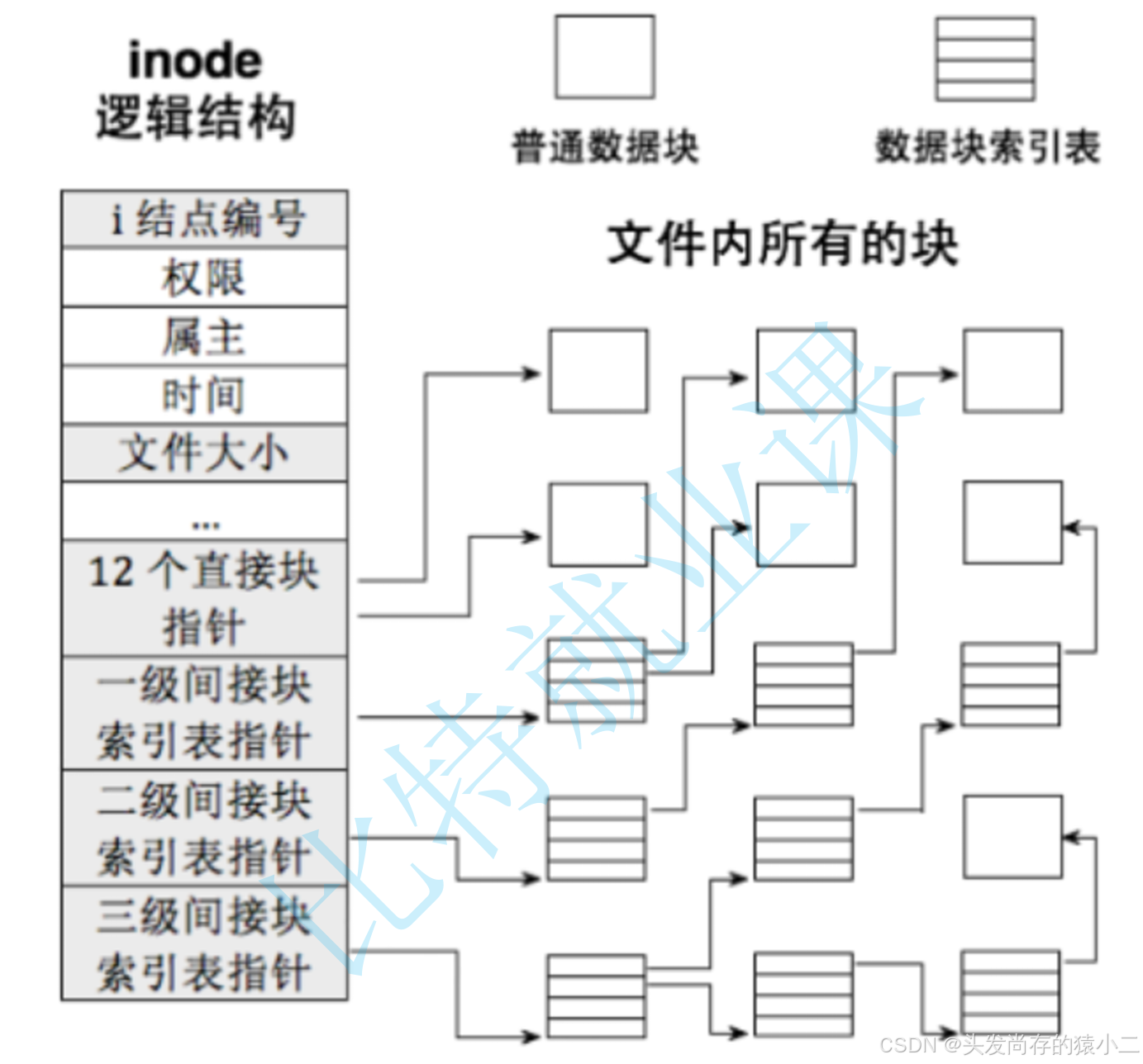 - 对于普通⽂件,⽂件的数据存储在数据块中。
