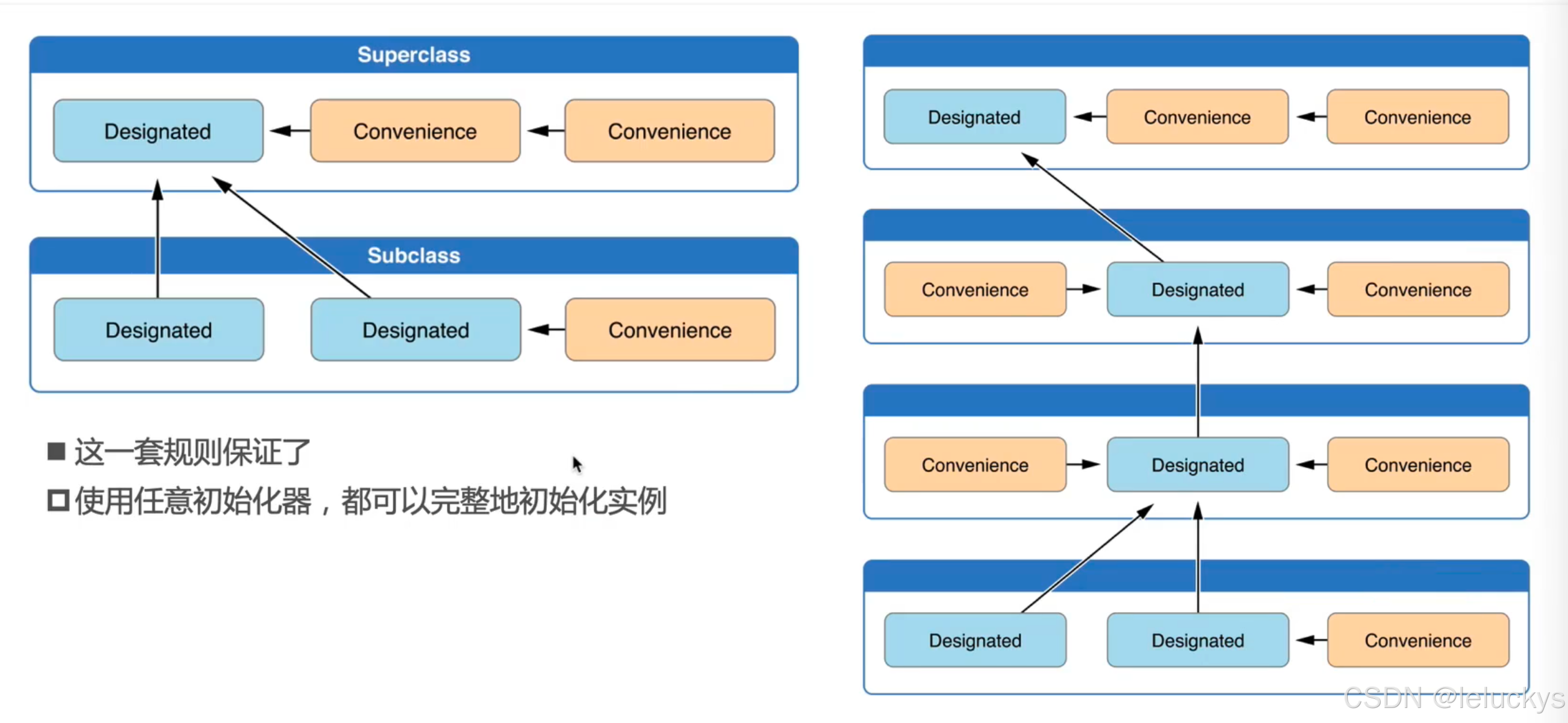 类偏向于少量指定初始化器,一个类通常只有一个指定初始化器