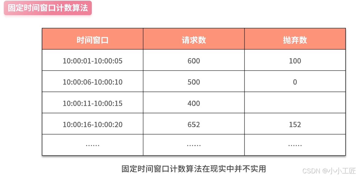假设 1 秒至4 秒有 200 个请求过来,5 秒时有 300 个请求过来,6 秒至 9 秒有 499 个请求过来,10 秒时有 1 个请求过来,通过计算得知:1 秒至 5 秒总计 500 个请求,6 秒至 10 秒也是总计 500 个请求。