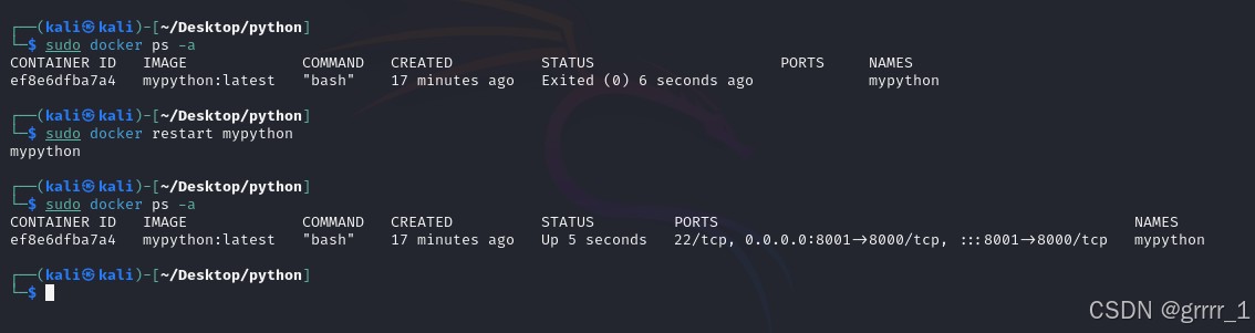 创建容器并启动:sudo docker run -it -d -p 8001:8000 --name mypython mypython
