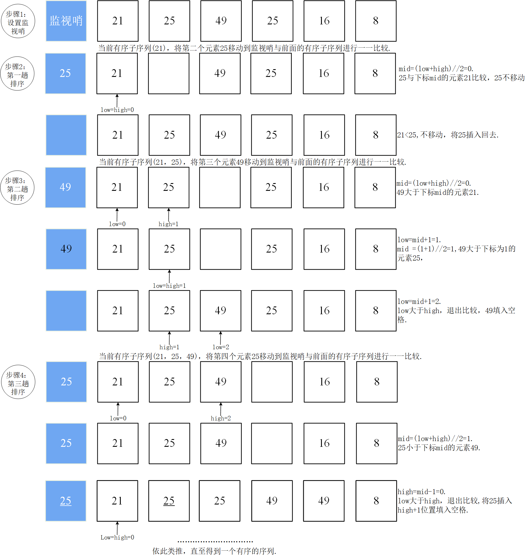 - 示意图:举例序列(21,25,49,25,16,8)
