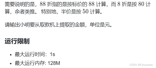double sum = 180.90*0.88+10.25*0.65+56.14*0.9+104.65*0.9+100.30*0.88+297.15*0.5+26.75*0.65+130.62*0.5+240.28*0.58+270.62*0.8+115.87*0.88+247.34*0.95+73.21*0.9+101.00*0.5+79.54*0.5+278.44*0.7+199.26*0.5+12.97*0.9+166.30*0.78+125.50*0.58+84.98*0.9+113.35*0.68+166.57*0.5+42.56*0.9+81.90*0.95+131.78*0.8+255.89*0.78+109.17*0.9+146.69*0.68+139.33*0.65+141.16*0.78+154.74*0.8+59.42*0.8+85.44*0.68+293.70*0.88+261.79*0.65+11.30*0.88+268.27*0.58+128.29*0.88+251.03*0.8+208.39*0.75+128.88*0.75+62.06*0.9+225.87*0.75+12.89*0.75+34.28*0.75+62.16*0.58+129.12*0.5+218.37*0.5+289.69*0.8;