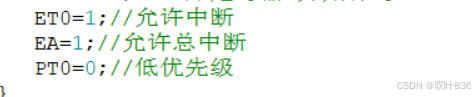 这里我们定义好定时器0后,TF0=1,ET0=1,打开中断,随后PT0=0,接入低级优先: