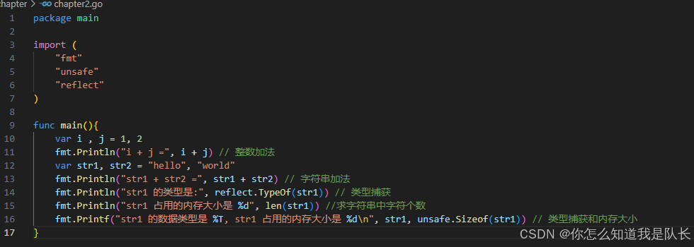 fmt.Printf("str1 的数据类型是 %T, str1 占用的内存大小是 %d\n", str1, unsafe.Sizeof(str1)) // 类型捕获和内存大小
