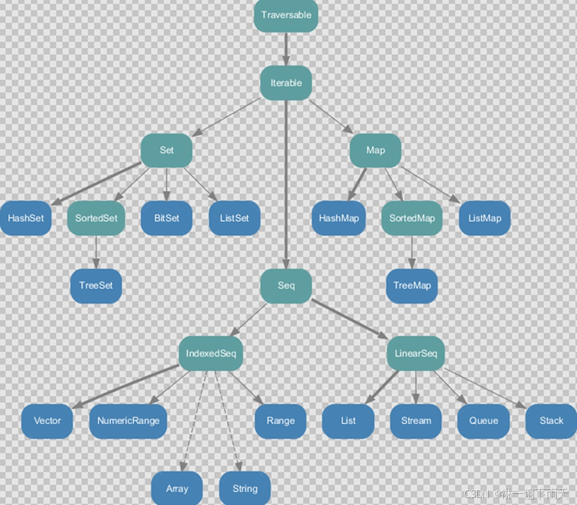 Scala集合分为三大类:序列(Seq)、集(Set)、映射(Map),所有集合都扩展自Iterable特质。集合分为可变集合和不可变集合: