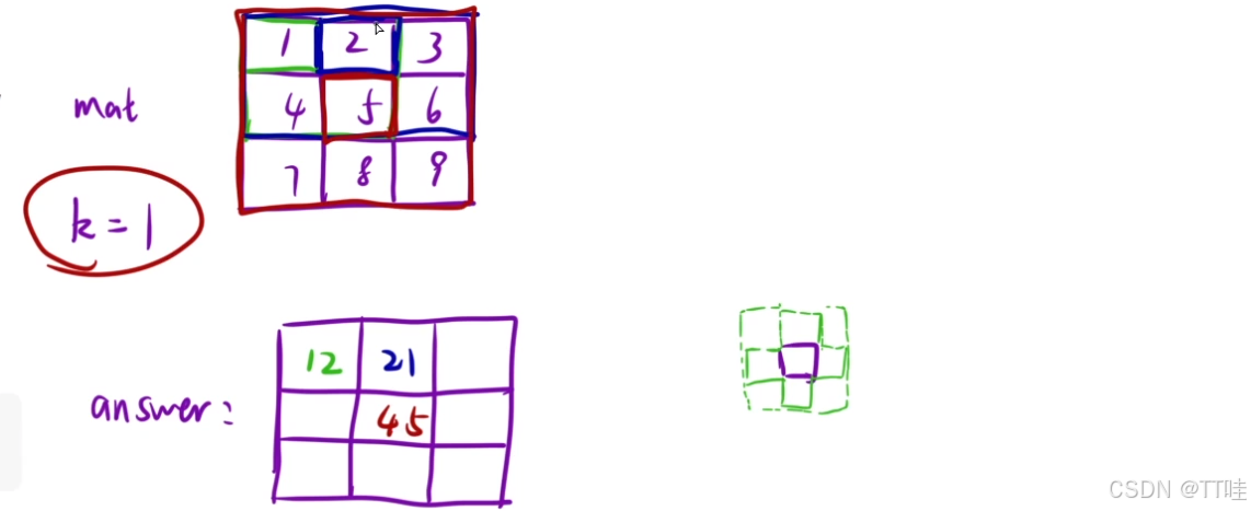 给你⼀个 m x n 的矩阵 mat 和⼀个整数 k ,请你返回⼀个矩阵 answer ,其中每个 answer[i][j] 是所有满⾜下述条件的元素 mat[r][c] 的和:
