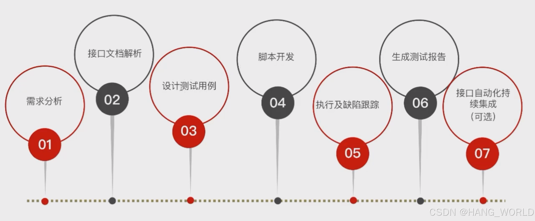 需求分析 -- 接口文档的解析 -- 设计测试用例 -- 脚本开发 -- 缺陷跟踪 -- 生成测试报告 -- 接口自动化持续集成