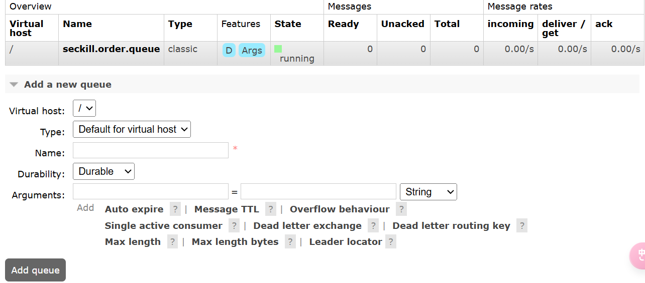 创建queues,名字为seckill.order.queue