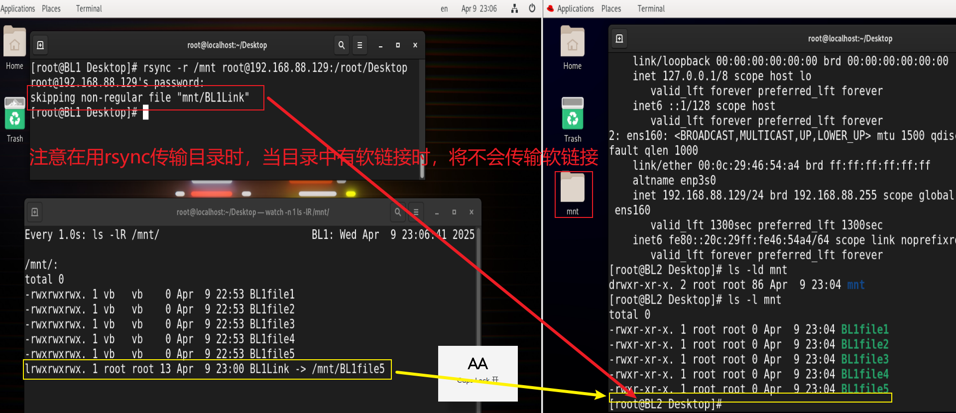 rsync -lr /mnt root@192.168.88.129:/root/Desktop